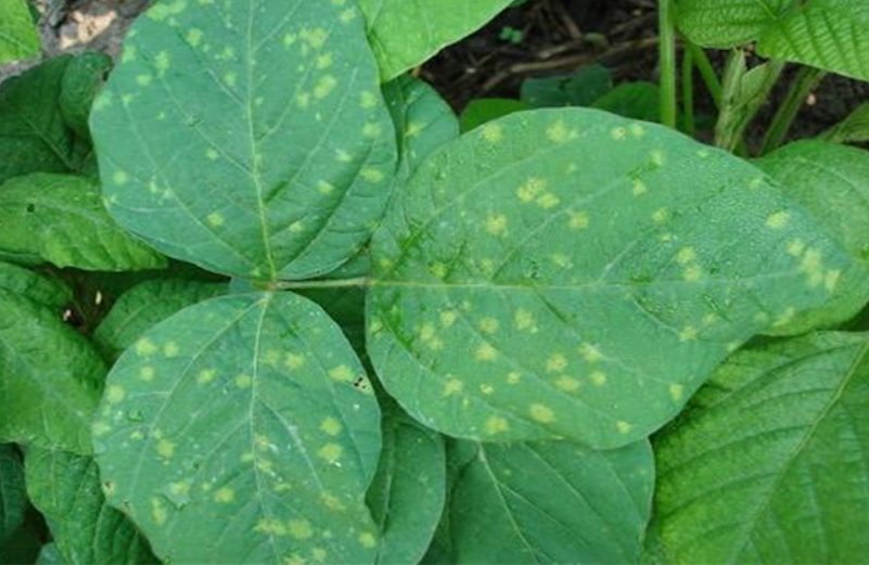 大豆霜霉病在大豆整个生育期均可发病,主要为害大豆幼苗、叶片、荚和籽粒,发病后减产5-15%,一般种子被害率达10%左右 ,严重者达26%以上,个别高达60%。含油量降低2.7-7.5%。大豆霜霉病发病明显的症状是叶背产生霜霉状物。花期前后气候潮湿时,病斑背面密生灰色霉层 ,后病叶变黄转褐而枯死。叶片受再侵染时,形成褪绿小斑点 ,以后变成褐色小点,背面产生霉层 。受害重的叶片干枯,早期脱落。豆荚被害,外部无明显症状,但荚内有很厚的黄色霉层,为病菌的卵孢子 。被害籽粒色白而无光泽 ,表面附有一层黄白色粉末状卵孢子 。