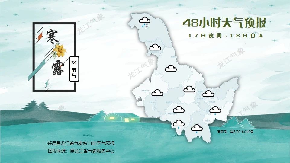 17日夜间到18日白天:大兴安岭北部多云有雨夹雪,哈尔滨南部、双鸭山、七台河、鸡西、牡丹江多云有阵雨,其它地区多云。